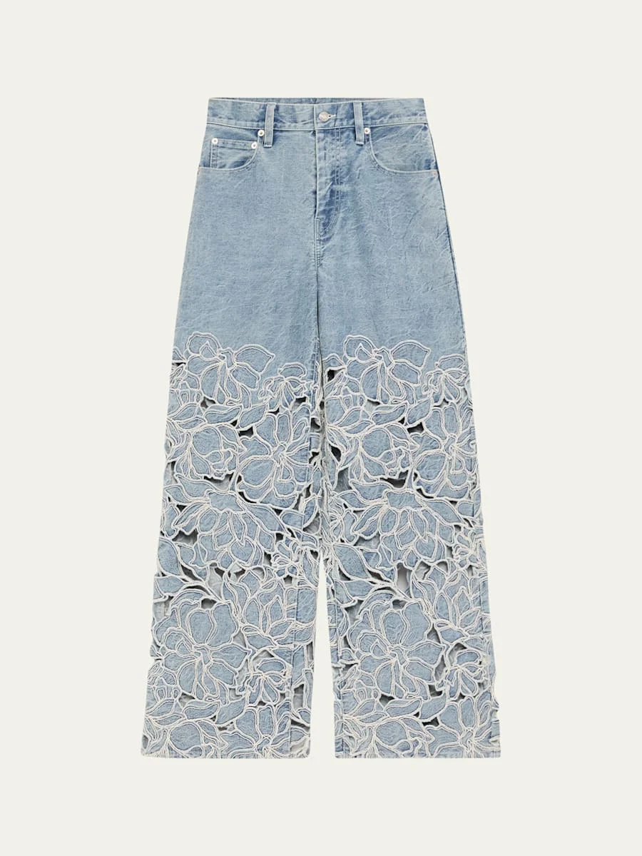 SIMKHAI "Betty" jeans decorated with intricate floral embroidery in lightwash denim Midrise; sits high on the hip Fivepocket style Straight legs Full length Button/zip fly; belt loops Cotton Wash inside out Imported
