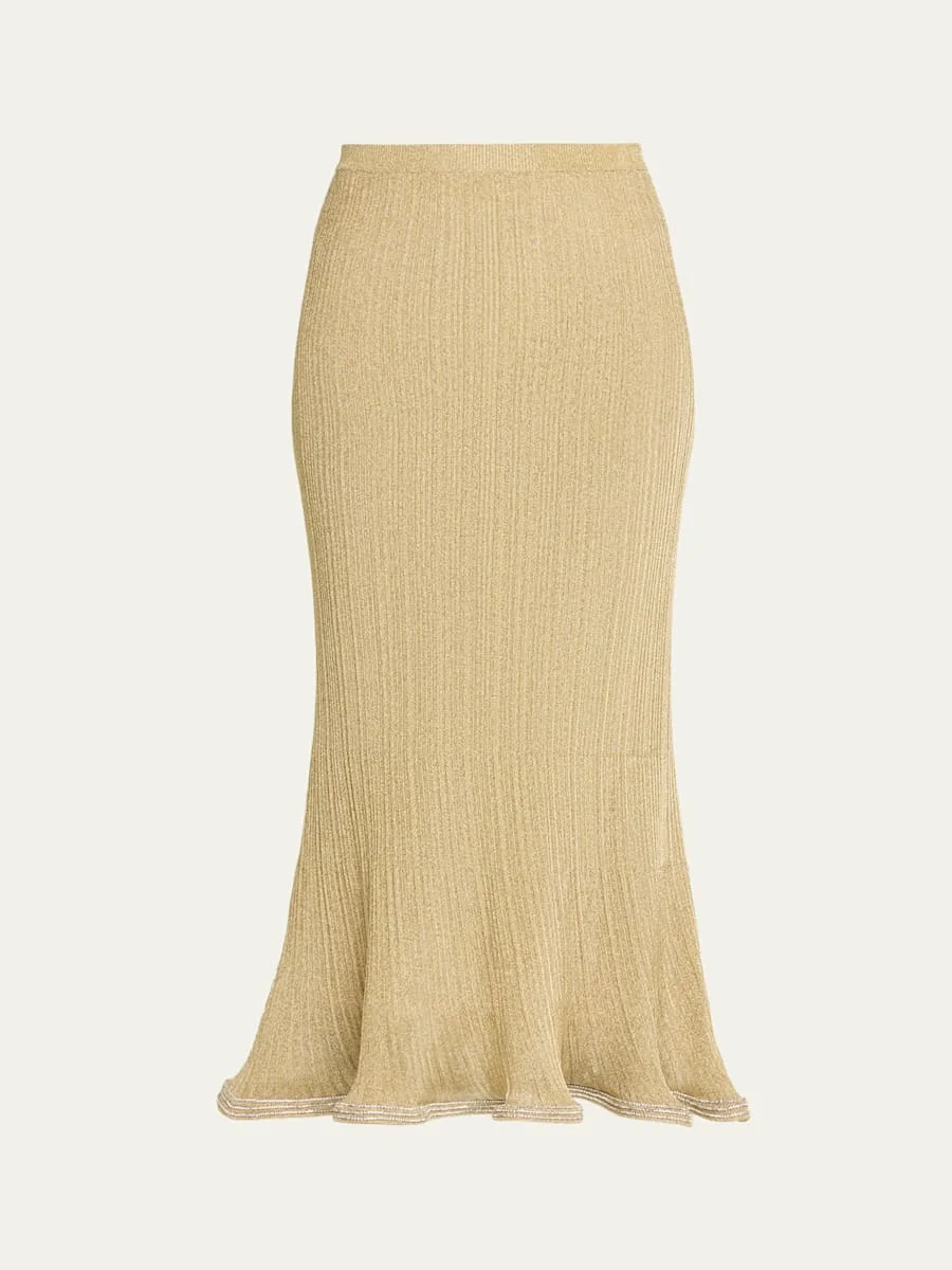 This "Brighton" midi skirt from SIMKHAI is crafted in shimmering plisse knit, finished with rhinestones along the fluted hem Sits high on the hips Hem falls below the knee Fluted hem Pencil silhouette Pullon style Viscose/polyester Imported