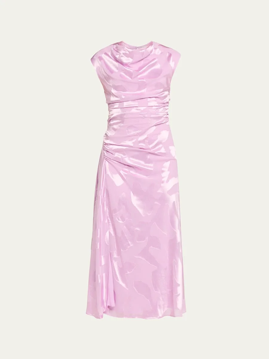 Crafted in satin with an abstract motif, the "Burke" midi dress by SIMKHAI flatters the figure with draping and gathering for an effortless silhouette. Cowl neckline Sleeveless Slim silhouette Hem falls below the knee Side zip; back keyhole closure Viscose/polyester Dry clean only Imported Online Inquiries: BGS21_T6WDB| Store Inquiries: #5042904
