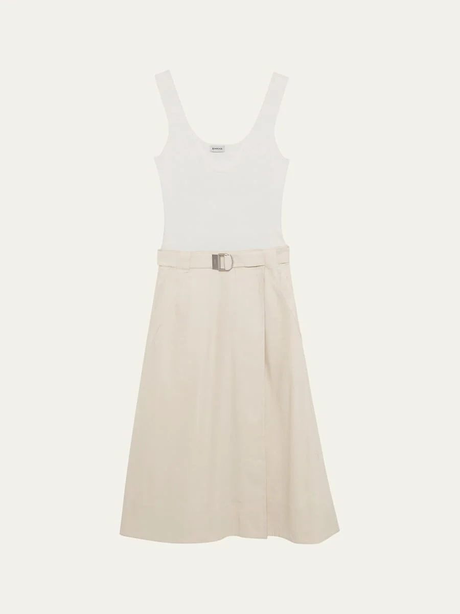 SIMKHAI "Camden" midi tank dress crafted from a knit and linen combo Scoop neckline Sleeveless Fitted bodice Adjustable D-ring belt Four-pocket style Wrap skirt Hem falls below the knee Side zip Viscose/linen/polyester Lining: Cotton Machine wash cold or dry clean Imported Online Inquiries: BGS21_T6MM9| Store Inquiries: #5011697