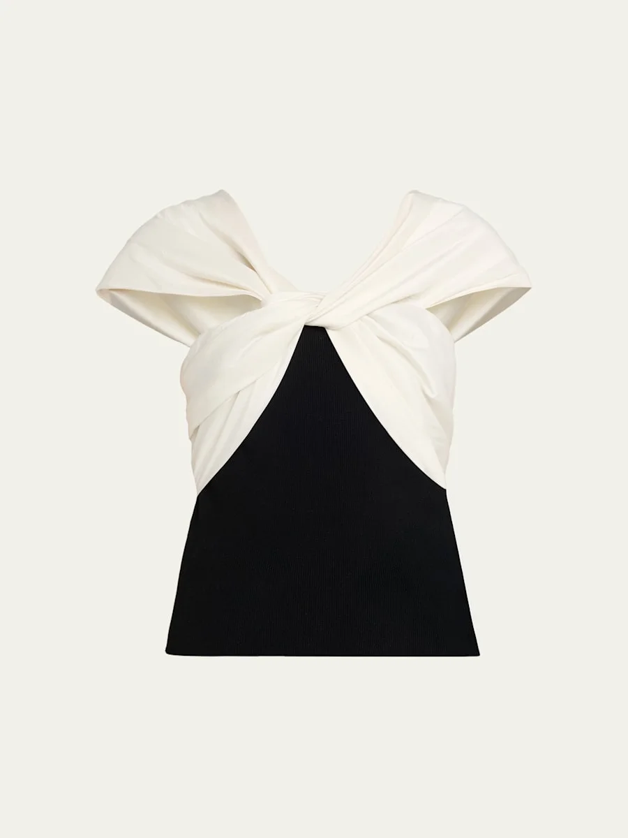 SIMKHAI "Celiana" combo top featuring a twist-front Off-the-shoulder neckline Sleeveless Fitted Hem sits at the front Pullover style Rayon/cellulose acetate/elastane/polyester Dry clean Imported Size Note: Item runs small, consider ordering a size up. Model height: 5'10"/177cm. Online Inquiries: BGS21_T632M| Store Inquiries: #4891538