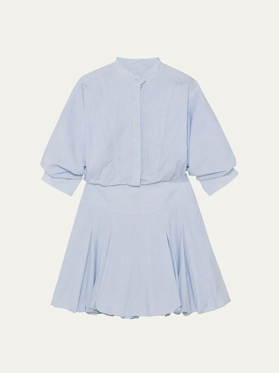 SIMKHAI "Effie" mini shirtdress finished with a bubble hem Stand collar Three-quarter sleeves with button cuffs Side seam pockets A-line silhouette Hem falls above the knee Concealed button-front Cotton/polyester Dry clean Imported Online Inquiries: BGS21_T6WCX| Store Inquiries: #5042888