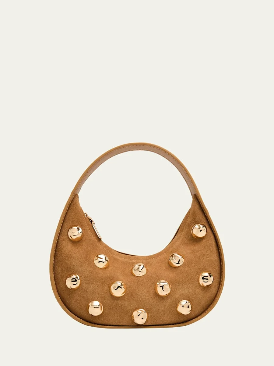 Crafted in rich suede, the "Finn" shoulder bag from SIMKHAI showcases a crescent silhouette with goldtone domed studs Flat shoulder strap, 5.9" drop Zip top closure Interior, one card slot Approx. 7.9"H x 10.2"W x 3.1"D Imported