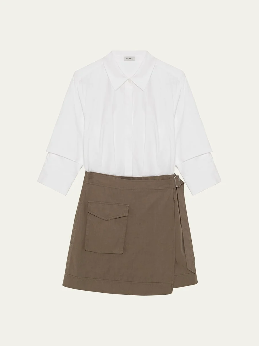 SIMKHAI "Fraser" combo mini dress featuring a wrap cargo skirt Point collar; button-front Three-quarter sleeves with button cuffs Side flap pocket; back patch pockets Shirtdress silhouette Hem falls above the knee Slipover style Tencel® lyocell/cotton Dry clean Imported Online Inquiries: BGS21_T6WD9| Store Inquiries: #5042902