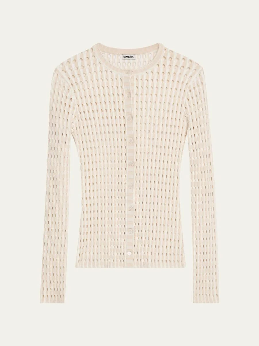 SIMKHAI "Gracen" cardigan featuring lasercut detailing Crew neckline Long sleeves Fitted Hem falls to the hip Buttonfront Rayon/cellulose acetate/polyester Dry clean Imported