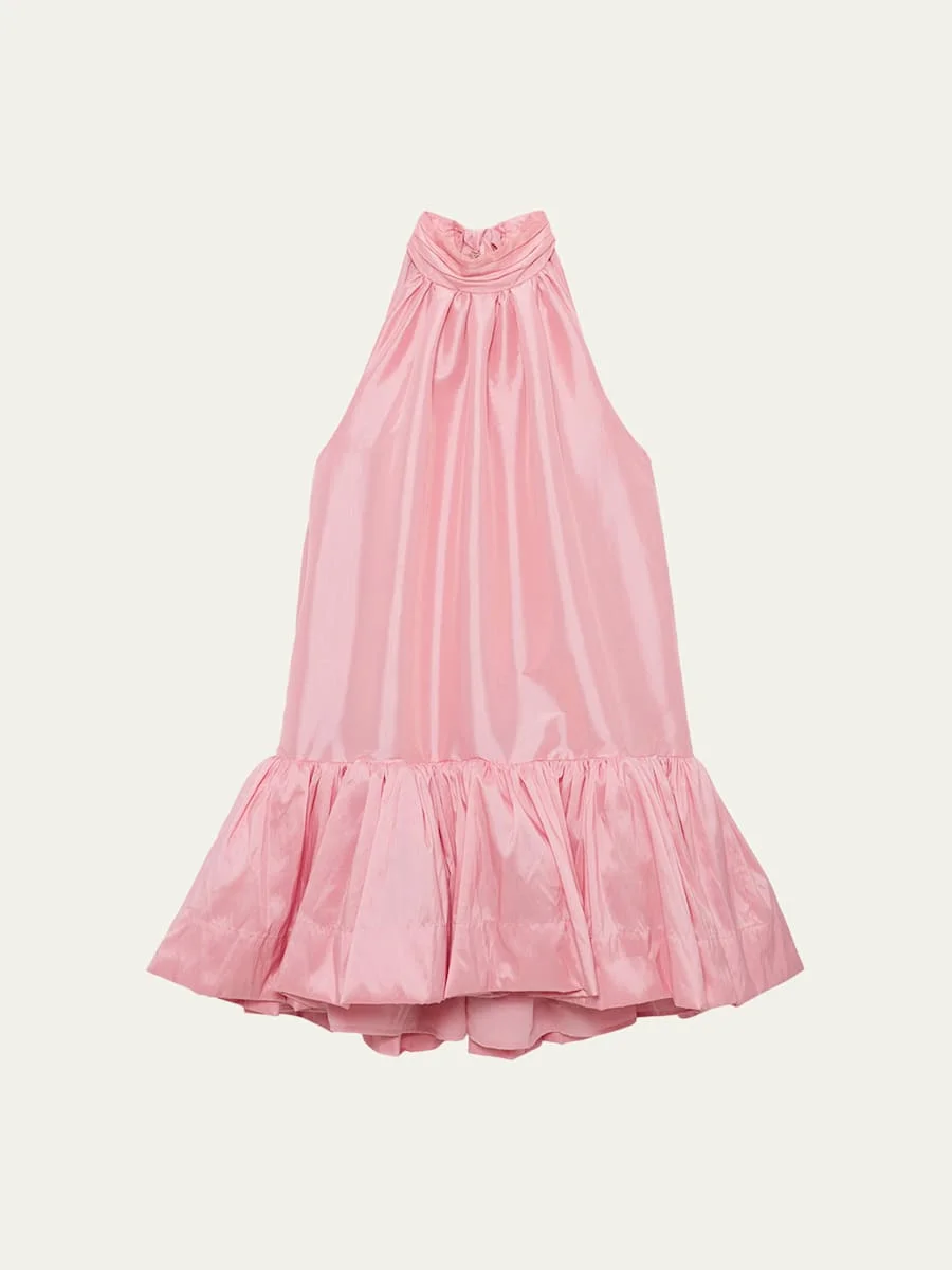 SIMKHAI's "Hope" dress is crafted from taffeta with a bow neck tie and voluminous ruffled hem Approx. 30"L from shoulder to hem Halter neckline; selfties behind the neck Sleeveless Hem falls above the knee Softly structured Aline silhouette Slipover style Polyester/nylon/polyamide Dry clean Imported