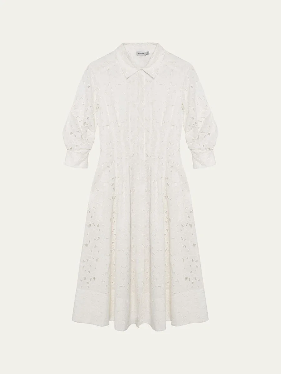 Jazz pleated broderie anglaise cotton midi shirt dress White