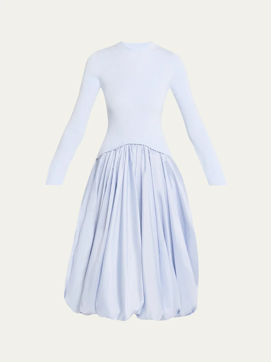 SIMKHAI "Kenlie" combo midi dress featuring a ribknit bodice finished with a bubble skirt Mock neckline Long sleeves with split cuffs Aline silhouette Hem falls below the knee Slipover style Rayon/cellulose acetate/elastane/polyester Lining: Polyester Dry clean Imported