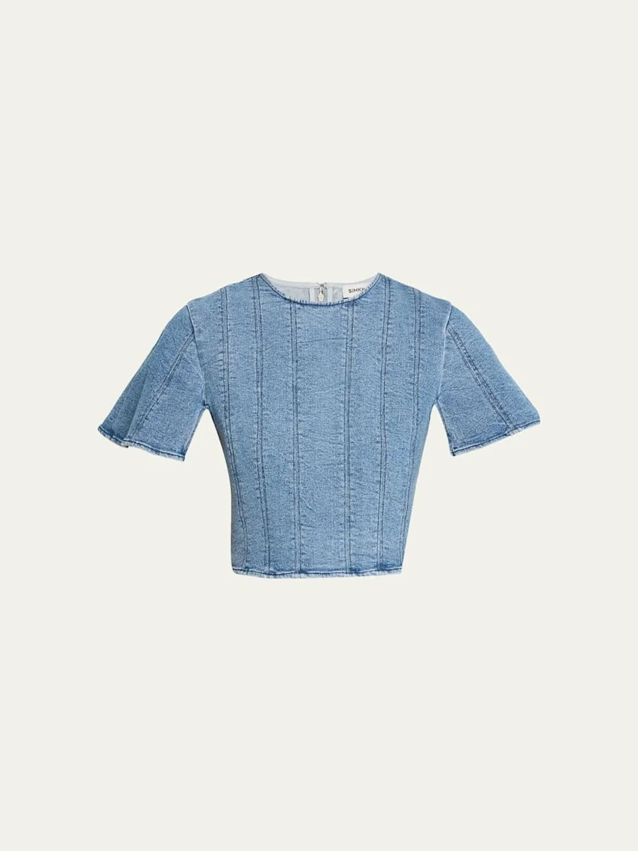 SIMKHAI "Kolby" denim top adorned with split short sleeves for a modern finish Crew neckline Cropped fit Center back zip Cotton/elastane Dry clean Imported