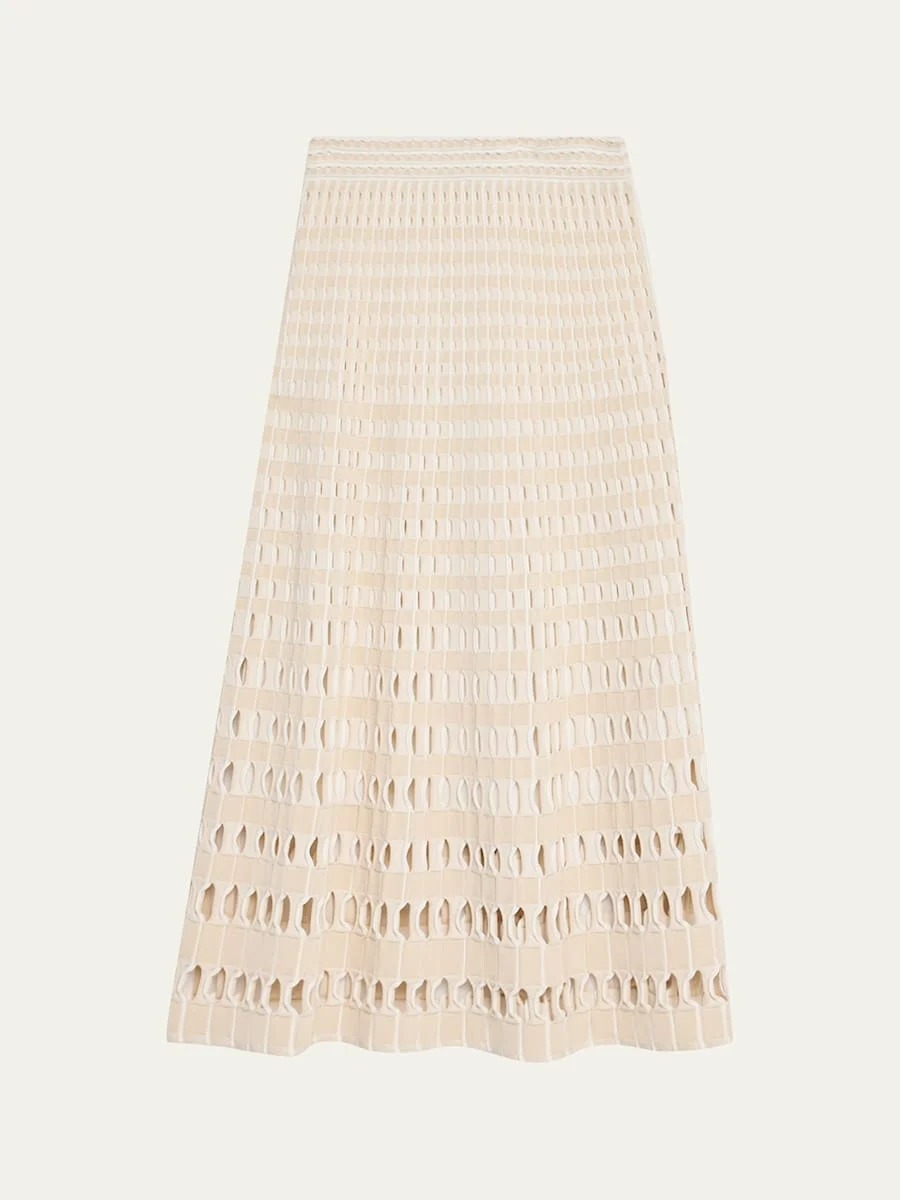 SIMKHAI "Larken" midi skirt featuring lasercut detailing High rise Elastic waistband Aline silhouette Hem falls below the knee Pullon style Rayon/cellulose acetate/polyester Dry clean Imported