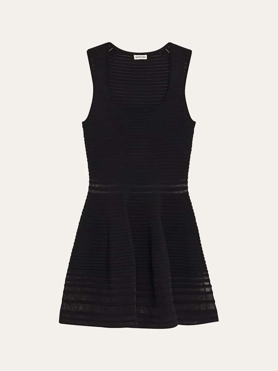 SIMKHAI "Lottie" illusion knit mini dress enhanced with tonal stripes and sheer paneling Scoop neckline Sleeveless Fit-and-flare silhouette Hem falls above the knee Slipover style Polyester/rayon/cellulose acetate Dry clean only Imported Online Inquiries: BGS21_T6UEL| Store Inquiries: #5038635