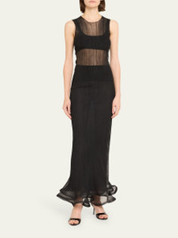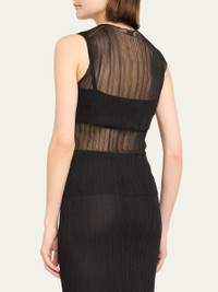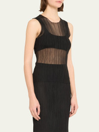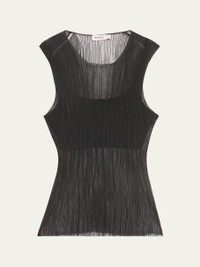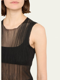 SIMKHAI "Oakley" sheer plisse knit tank top with a tonal bralette Approx. 21.5”L from shoulder to hem Round neckline Sleeveless Slim fit Hip length Pullover style Polyester Lining: Nylon/rayon/spandex Dry clean Imported Model is 5'10"/177cm. Online Inquiries: BGS21_T63J9| Store Inquiries: #4716361