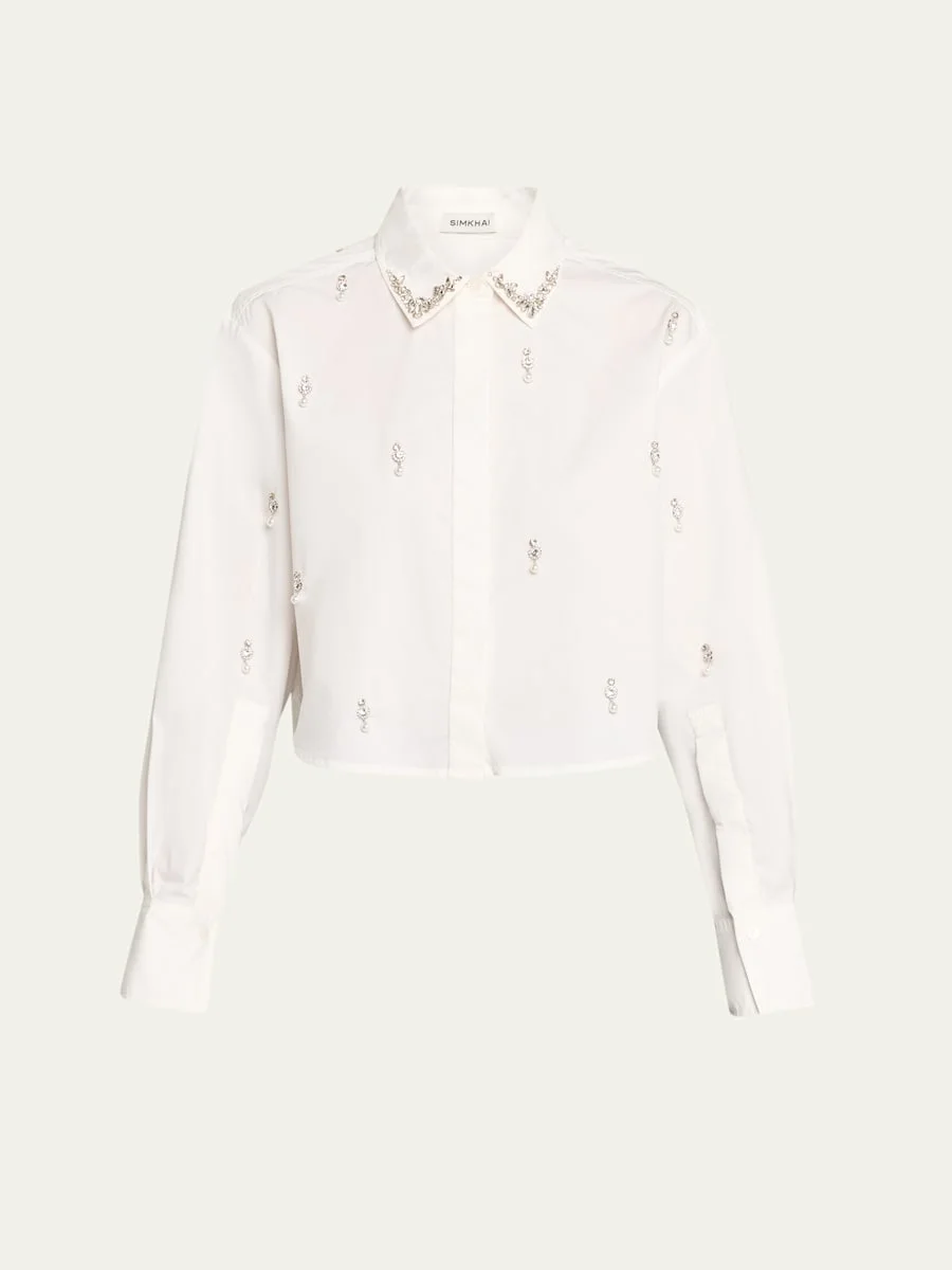 SIMKHAI "Renata" crisp cotton poplin shirt adorned with crystalembellishment Point collar Long sleeves with button cuffs Classic fit Cropped length Hidden buttonfront Cotton/polyester Lining: Cotton Dry clean Imported