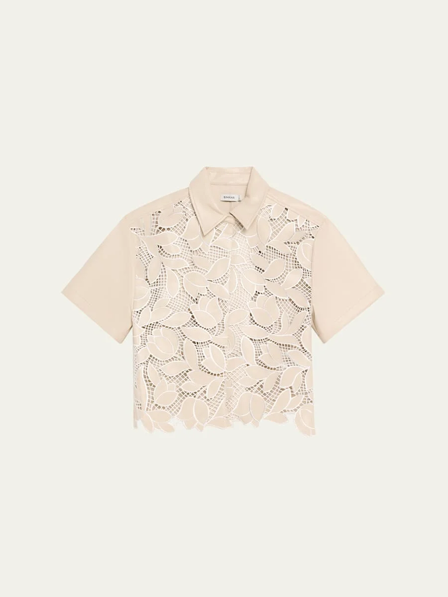SIMKHAI "Robinson" embroidered faux-leather camp shirt Point collar Short sleeves Slim fit Hem sits at the hip Concealed front closure Polyester/cotton/polyurethane Dry clean Made in USA Online Inquiries: BGS21_T6J8U| Store Inquiries: #4991840