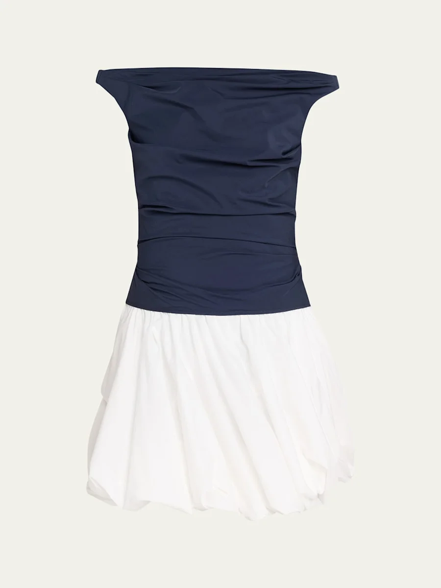 The "Salina" mini dress by SIMKHAI is crafted from twotone cotton poplin and boasts a soft, ruched bodice that trails into a voluminous bubble hem. Wide boat neckline Sleeveless Dropwaist silhouette Hem falls above the knee Invisible side zip Cotton/polyester Dry clean Imported SIZE amp; FITModel measurements: 5'10" tall Model is wearing a US size 4/Small
