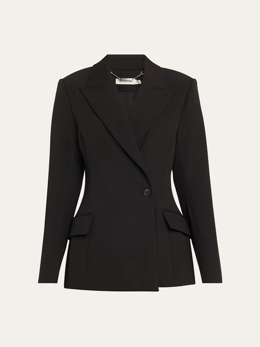 SIMKHAI "Surabhi" solid hourglass blazer Peak lapels Double-breasted front Long sleeves with button cuffs Hip flap pockets Defined waist Tailored fit Vented back Button-front Polyester/viscose/cotton Dry clean Imported Model is 5'10"/177cm. Online Inquiries: BGS21_T5YLQ| Store Inquiries: #4858092