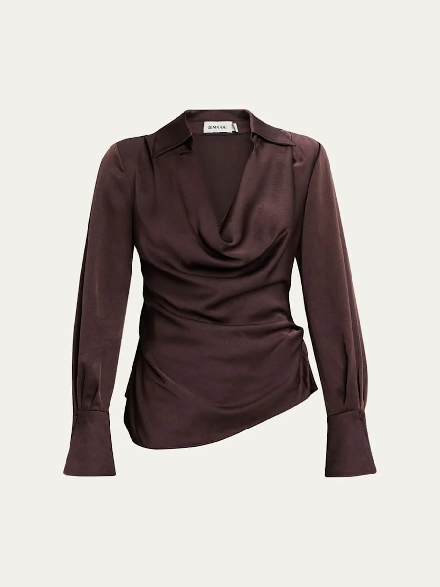 SIMKHAI "Symone" satin top finished with figure-flattering draping throughout Point collar; cowl neckline Long sleeves with button cuffs Classic fit Hem sits at the hip Pullover style Polyester Dry clean Imported Online Inquiries: BGS21_T6Z21| Store Inquiries: #5072793
