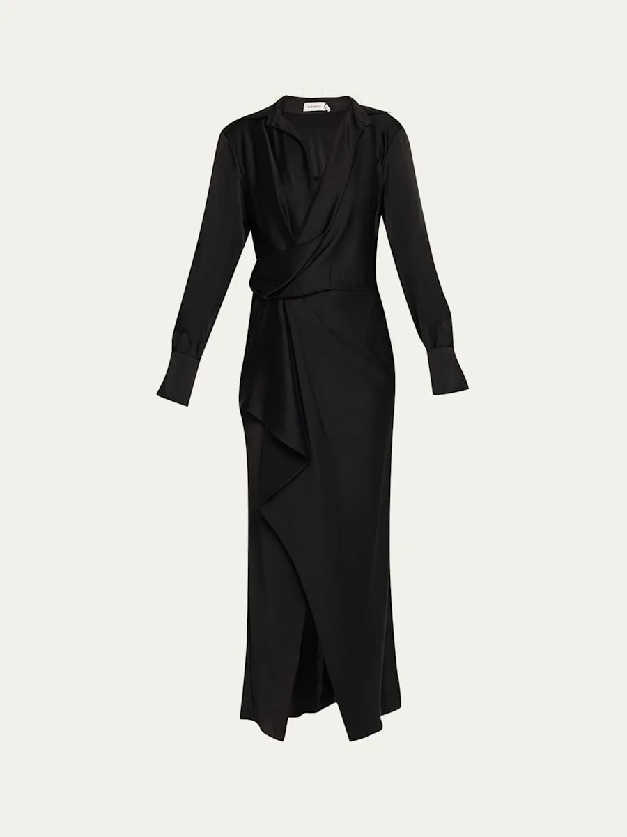 SIMKHAI "Talita" satin midi dress with draping V neckline Long sleeves with button cuffs Wrap silhouette Hem falls below the knee Side closure Acetate/polyester Dry clean Imported Model is 5'10"/177cm. Online Inquiries: BGS21_T5XMK| Store Inquiries: #4853093