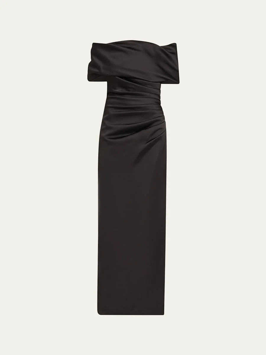 Cut from duchess satin, the "Valencia" gown from SIMKHAI is finished with structured pleats along the waist to define the figure Approx. 54.5"L from shoulders to hem Offtheshoulder neckline Elbow sleeves Side slit eases movement Full length Column silhouette Polyester/spandex Dry clean Imported