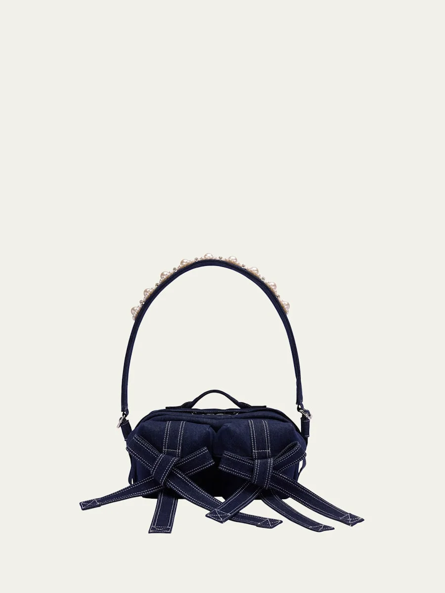 Classic Pearly-Embellished Bow Denim Crossbody Bag