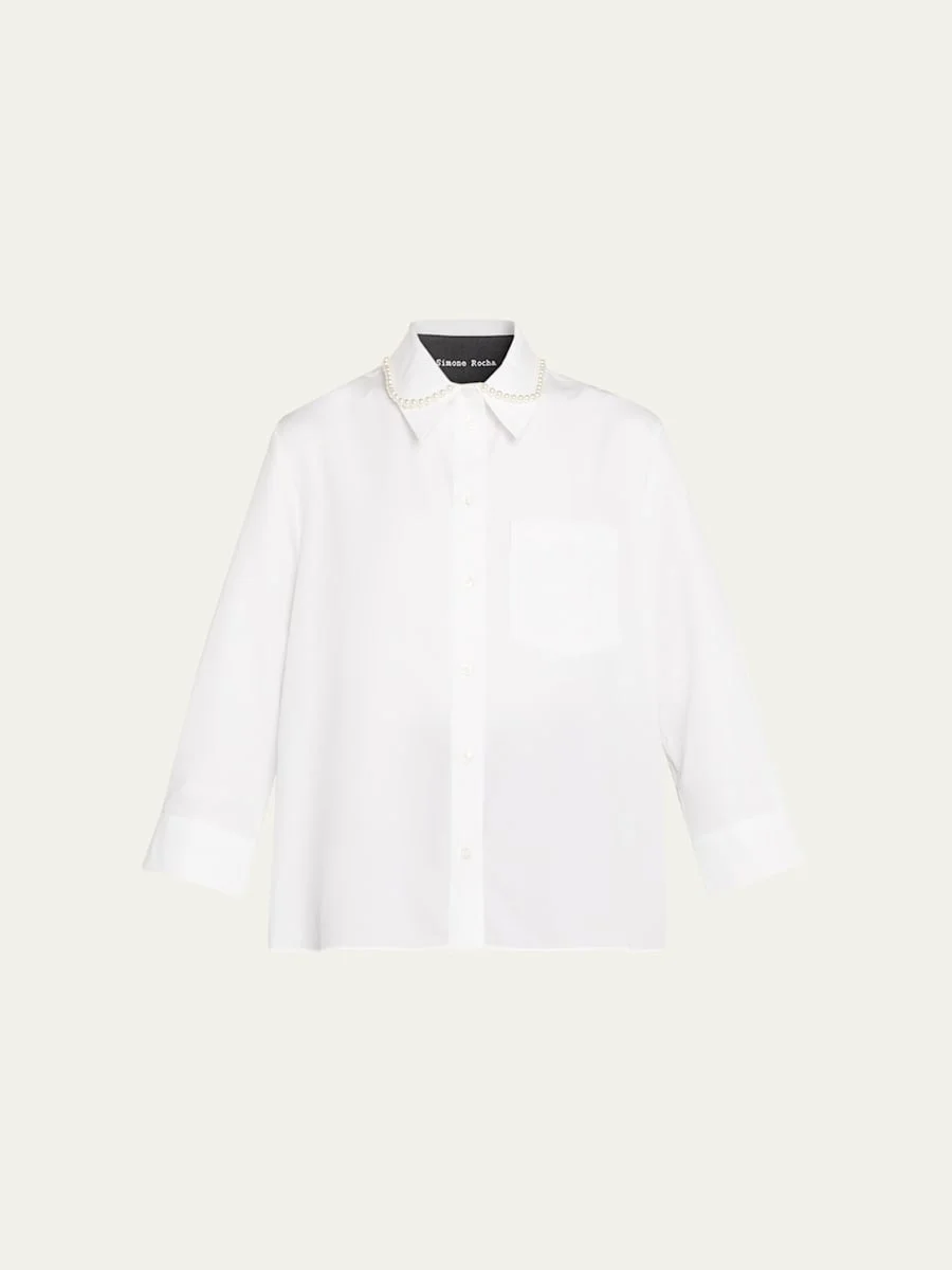A feminine take on a classic masculine silhouette, this abbreviated shirt by Simone Rocha features faux pearl collar embellishments Point collar; button front 3/4 sleeves; button cuffs Relaxed fit Cropped hem Cotton Made in Portugal