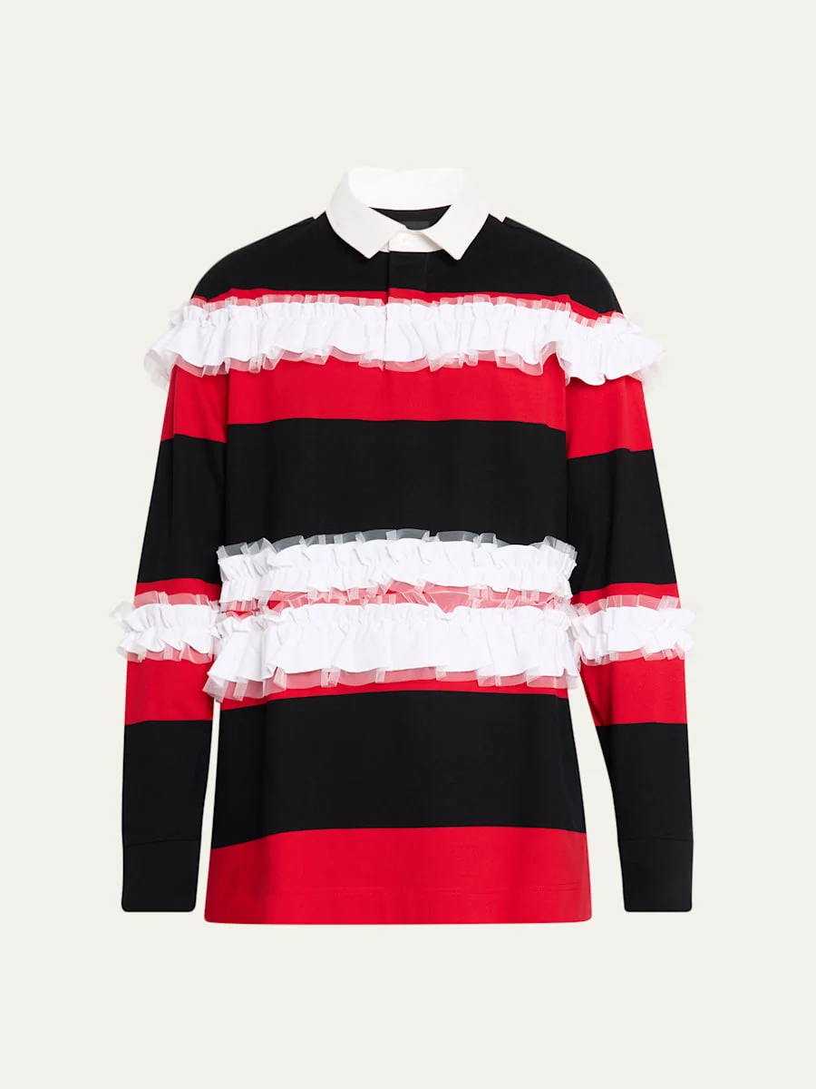 Simone Rocha polo shirt with bold horizontal stripes, embellished with ruffle trim for a charming flair Point collar Threebutton placket Long sleeves Ribbed cuffs Vented sides Pullover style Oversized fit Cotton/nylon/polyamide Made in Portugal