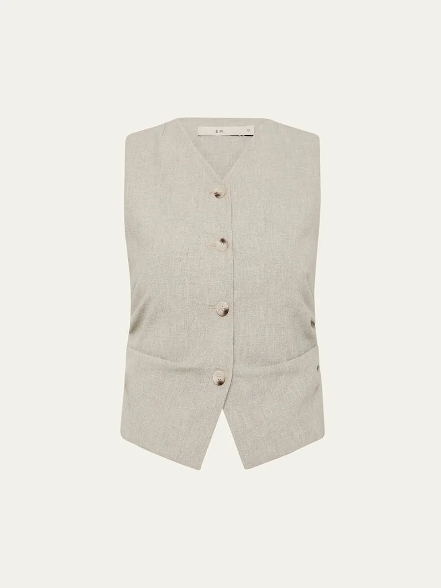 SIR "Leone" suiting vest with side ruching V neckline Sleeveless Tailored fit Cut-away hem Button-front Polyester Lining: Cotton Dry clean Imported Online Inquiries: BGS21_T6X9W| Store Inquiries: #5059378