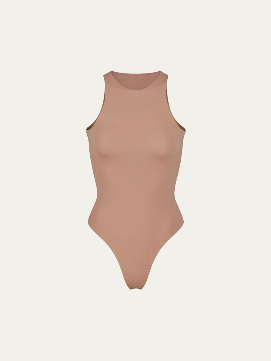 SKIMS bodysuit in signature Fits Everybody buttery soft stretch fabric High neckline Sleeveless High-cut leg openings Minimal seat coverage Formfitting Cotton-lined snap gusset Nylon/polyamide/elastane Imported Proposition 65 warning for California residents Model is 5'10"/177cm. Online Inquiries: BGS21_I2L9C| Store Inquiries: #4823776