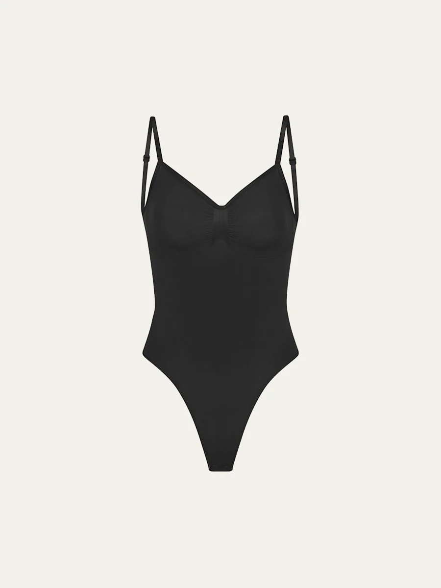 SKIMS "Seamless Sculpt" thong bodysuit with front pique stitching that supports and enhances the bust Strong, targeted compression for shaping and sculpting V neckline Sleeveless Adjustable straps Low-cut back Minimal seat coverage Formfitting Cotton-lined snap gusset Nylon/polyamide/elastane Imported Proposition 65 warning for California residents Model is 5'10"/177cm. Online Inquiries: BGS21_I2L9E| Store Inquiries: #4823814