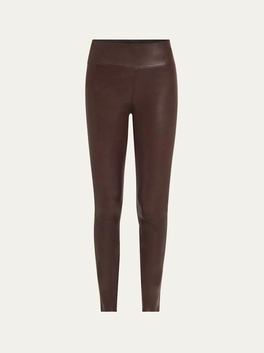 SPRWMN leather ankle legging. Inseam, approx. 28". High waist with wide elastic. Second-skin fit. Pull-on style. Leather. Specialist clean Made in USA of imported material. Model is 5'10"/177cm. Online Inquiries: BGS21_TY9NA| Store Inquiries: #2714161