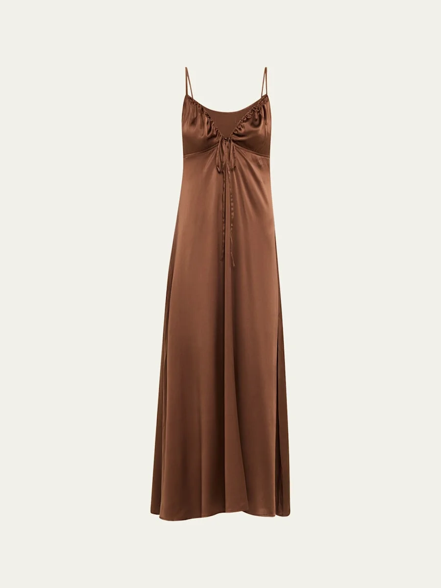 SPRWMN "Ibiza" endlessly versatile dress crafted from lightweight stretch silk Deep V neckline with self-ties Sleeveless Full length Subtle a-line silhouette Slipover style Silk Made in USA Online Inquiries: BGS21_T6WHL| Store Inquiries: #5052330