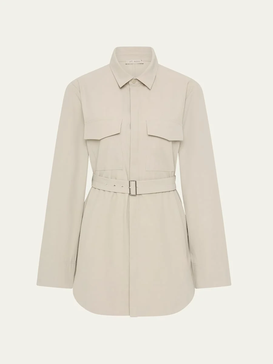 St. Agni utilityinspired shirt jacket featuring a removable belted waist Point collar Long sleeves Dual chest pockets Relaxed fit Rounded hem Concealed buttonfront Nylon/polyamide/organic cotton Machine wash cold Imported