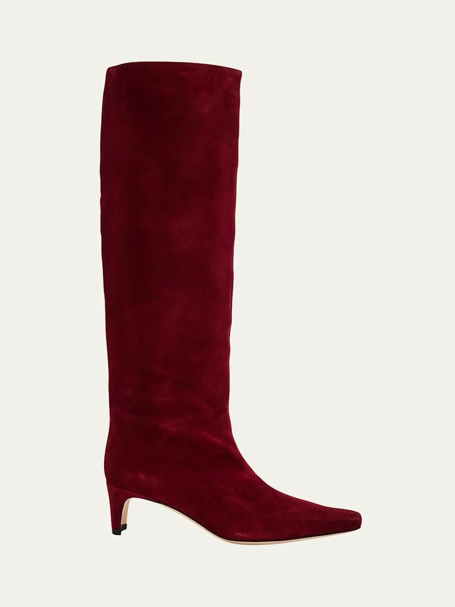 STAUD kneehigh boots in supple lambskin suede 2.3" covered heel Tapered square toe Pullon style Leather lining and sole Made in Portugal