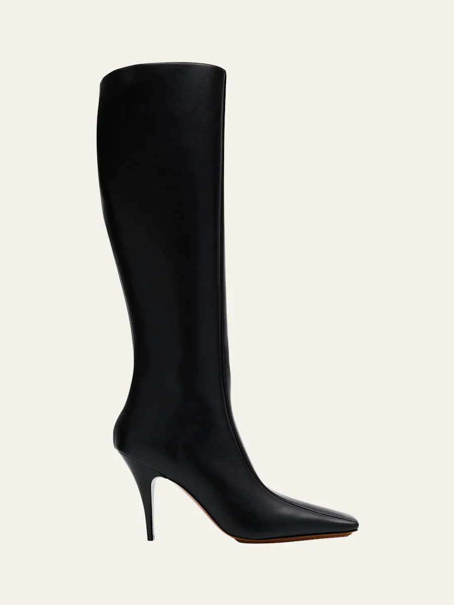 Stella McCartney "Alter" knee-high boots crafted in smooth vegan leather (TPU) 3.75 in / 95 mm stiletto heel Pointed square toe Side zip fastening Lining: Viscose Made in Italy Online Inquiries: BGS21_X6ZK3| Store Inquiries: #5071961