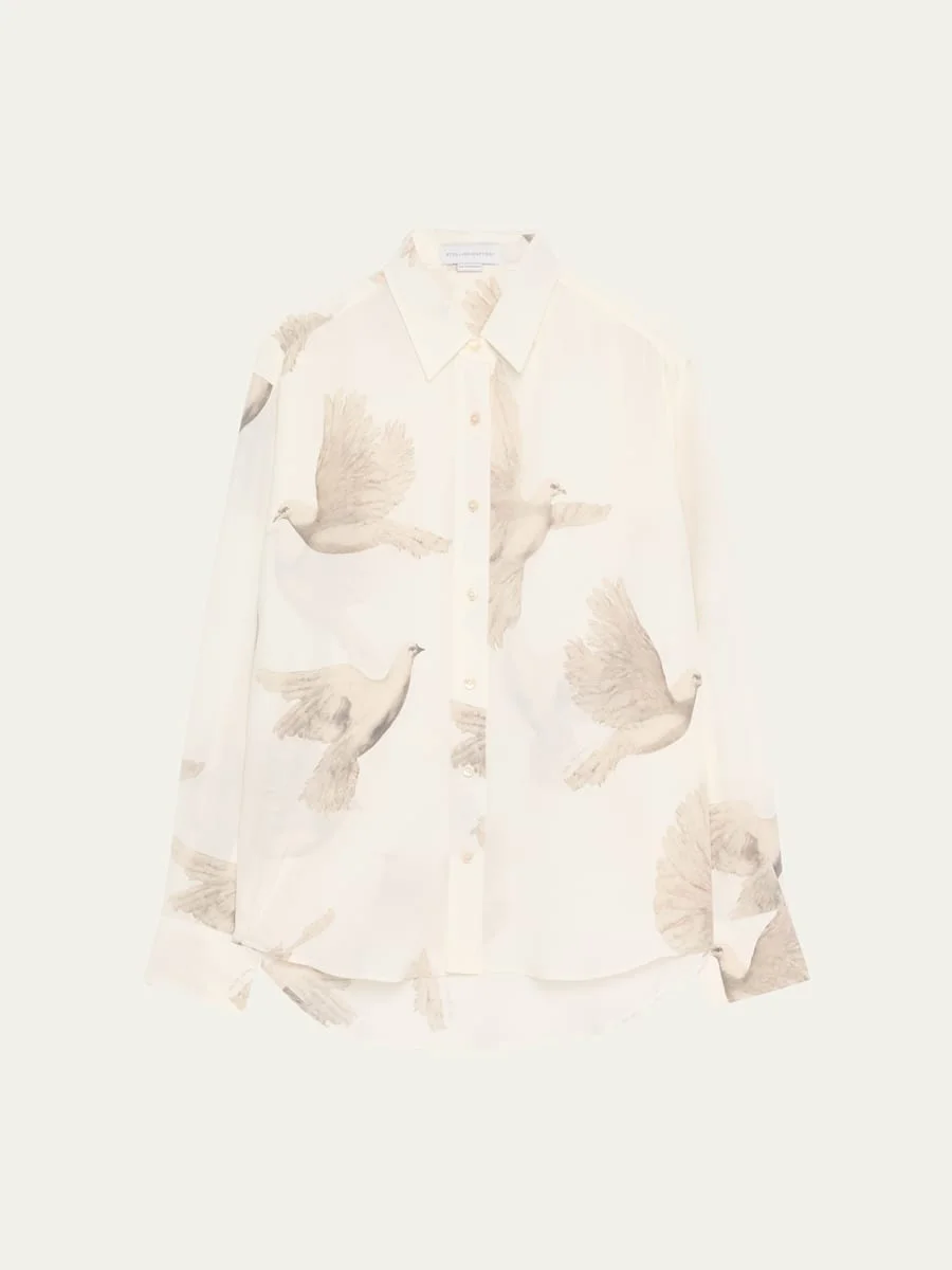 Stella McCartney crepe de chine top in bird print Spread collar; button front Long sleeves; button cuffs Oversized fit Back yoke Silk Dry clean Made in Italy Online Inquiries: BGS21_B9VC8| Store Inquiries: #4981524