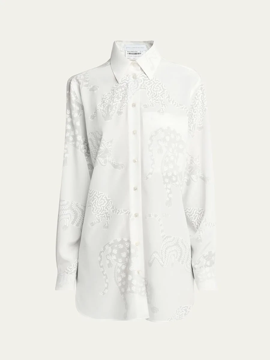 Stella McCartney burnout blouse features a playful feline motif on rich, textured fabric Point collar Long sleeves; button cuffs Button closure Relaxed fit Silk Dry clean Made in Romania Online Inquiries: BGS21_BA366| Store Inquiries: #5022975