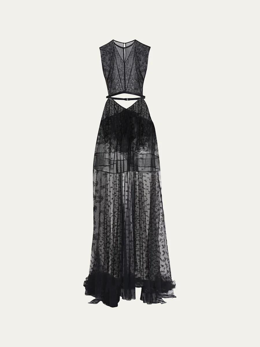 Valentino Garavani chantilly lace dress with cutout detail Crew neckline Sleeveless Maxi length A-line silhouette Zip closure Nylon/polyamide/viscose/cotton Acetate/silk lining Dry clean Made in Italy Online Inquiries: BGS21_B9VCJ| Store Inquiries: #4981534