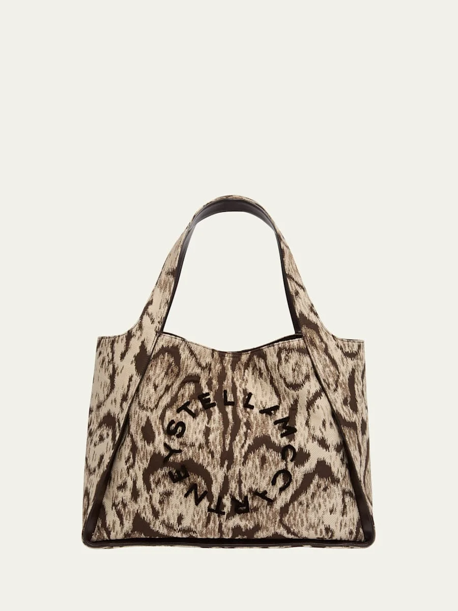 This handcrafted Stella McCartney tote bag is defined by the slouchy yet structured silhouette, crafted from luxurious jacquard with the Cloud Leopard print Features the signature circular logo with raised lettering on the front Flat top handles Open top with magnetic closure Interior, removable snap flap pouch Recycled polyester lining Approx. 12.4"H x 15.8"W x 5.9"D Cotton/polyester Made in Italy