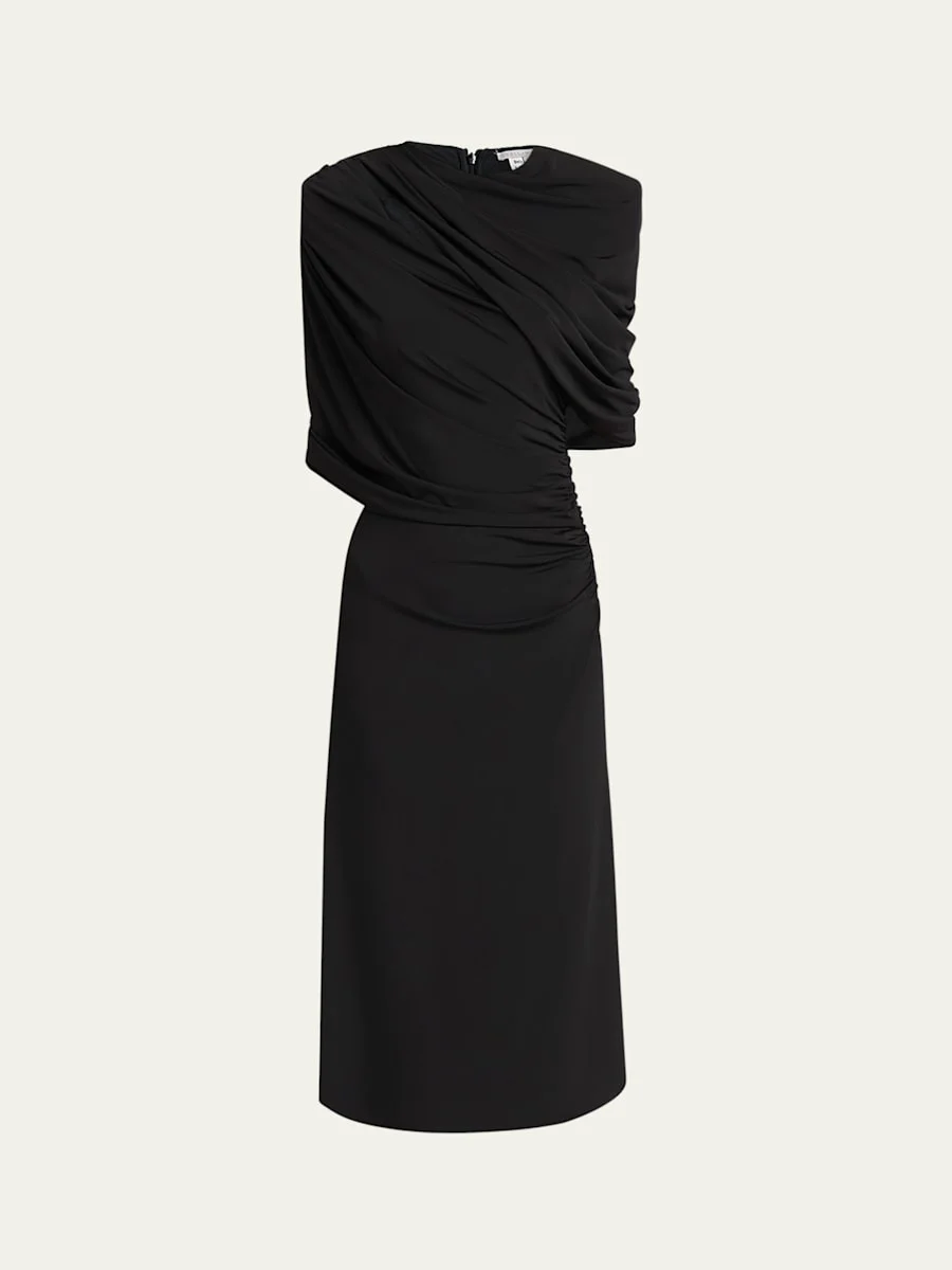 Stella McCartney dress with a draped cape Jewel neckline Elbow-length sleeves Midi length A-line silhouette Back zip Viscose/elastane Dry clean Made in Italy Model is 5'10"/177cm. Online Inquiries: BGS21_B9M5W| Store Inquiries: #4912068