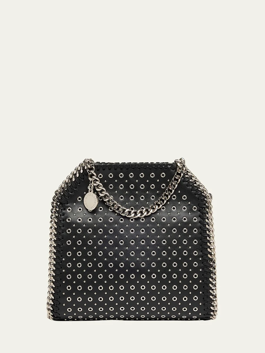 Stella McCartney "Falabella" alter mat polyester bag features allover eyelet embellishments Engraved logo charm medallion Dual top handles Adjustable crossbody strap Magnetic top closure Interior slip pocket One main compartment Approx. 7.1"W x 6.9"H x 2.36"D Spot clean Made in Italy Online Inquiries: BGS21_V6JXK| Store Inquiries: #5024428