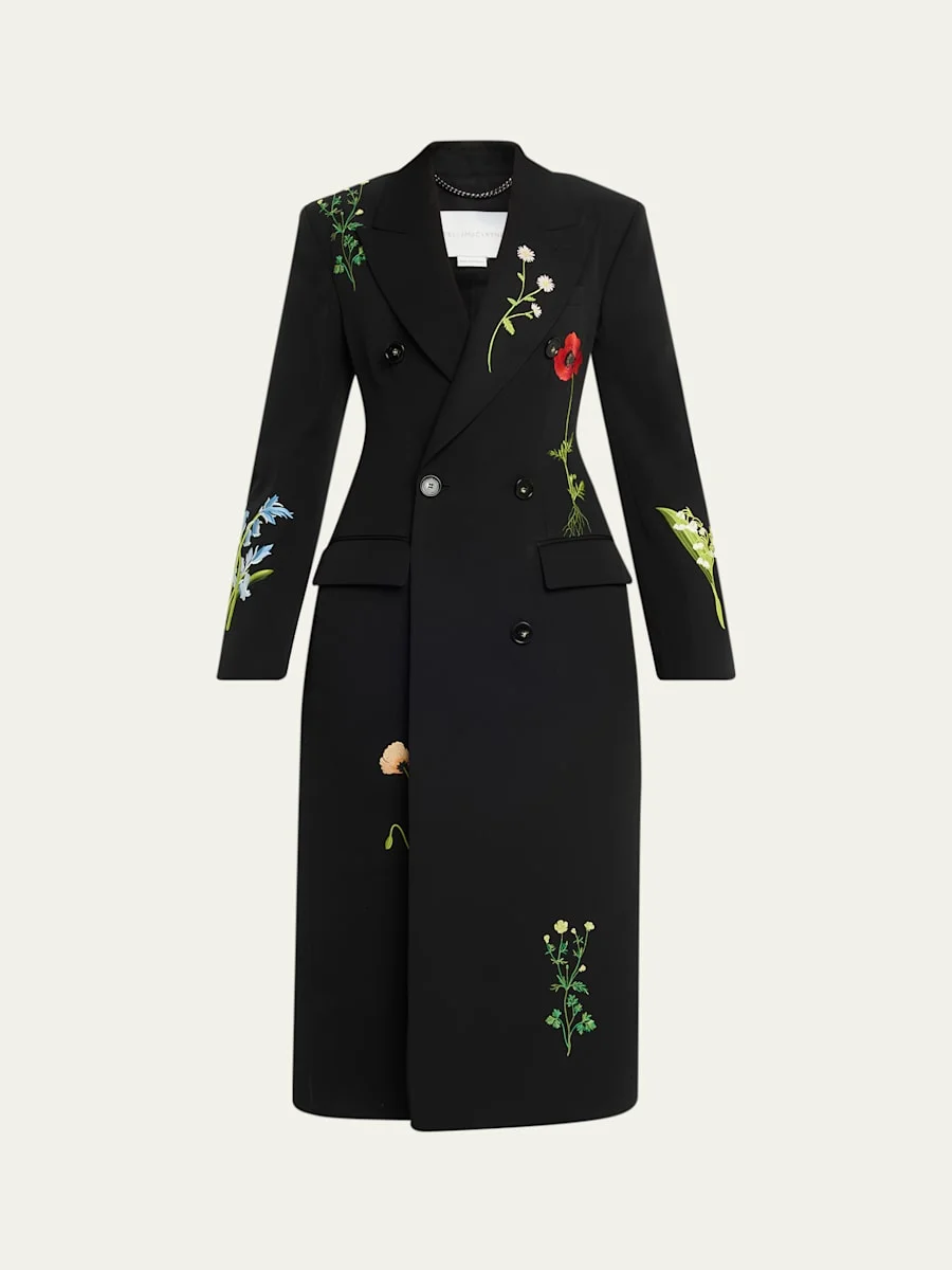 This waisted coat from Stella McCartney is crafted of wool, blooming with vibrant floral satinstitch embroidery. Peak lapels; doublebreasted front Long sleeves; button cuffs Structured shoulders Chest welt pocket Hip flap pockets Slim fit Full length Walking vent back Button front closure Wool Dry clean Made in Italy SIZE amp; FITModel measurements: 5'10" tall Model is wearing a US size 4/Small