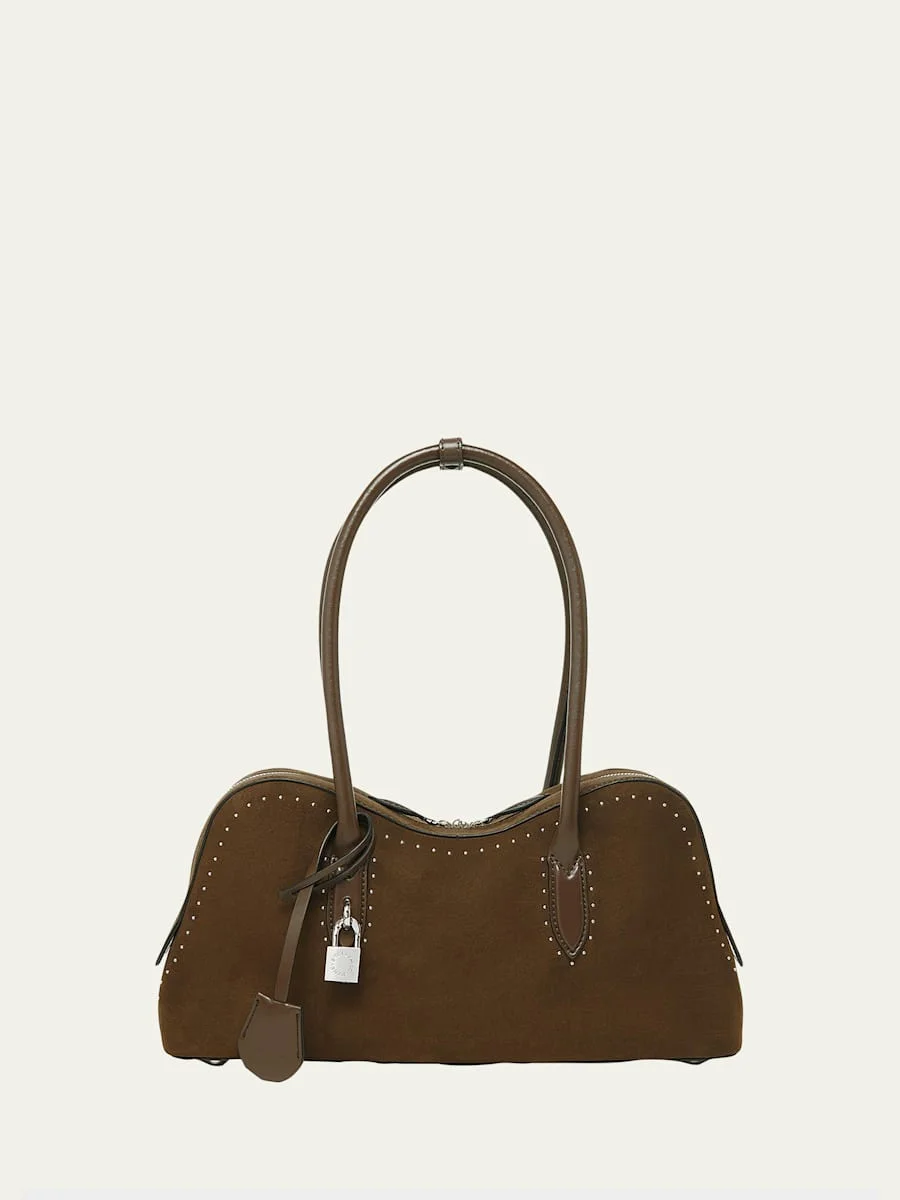 The Stella McCartney "Ryder" shoulder bag combines luxury with sustainability, crafted from an ultrasoft, waterresistant vegan alternative to suede. Rolled shoulder straps with snap strap; padlock and keyring charms Twoway zip top closure Interior, one slip pocket Feet protect bottom of bag Approx. 6.9"H x 14.2"W x 7.7"D Polyurethane/polyester Made in Italy