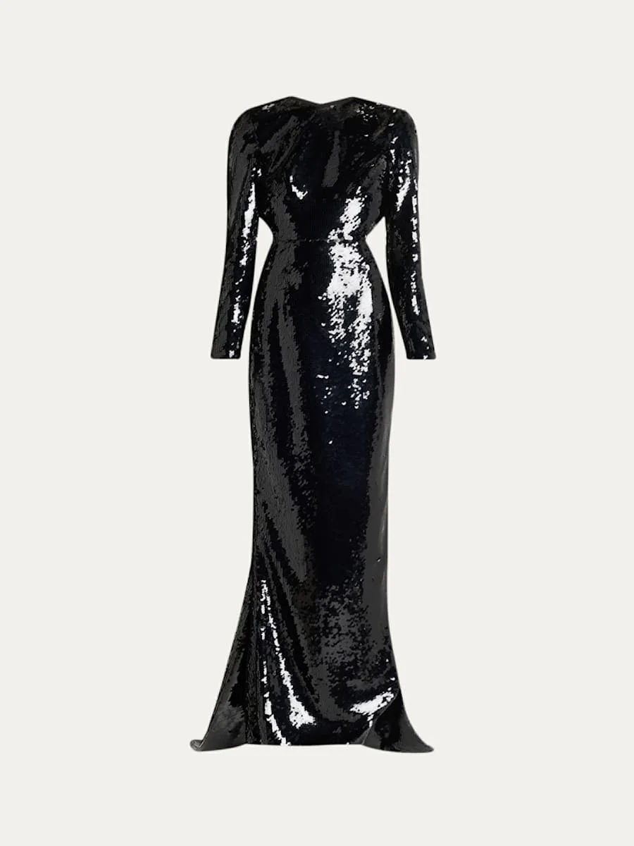 Stella McCartney gown shimmers in allover sequins, tailored with padded shoulders and a back cutout Round neckline; hookandeye back Long sleeves Padded shoulders Trumpet silhouette Floor sweeping hem Invisible back zip Polyester Made in Italy