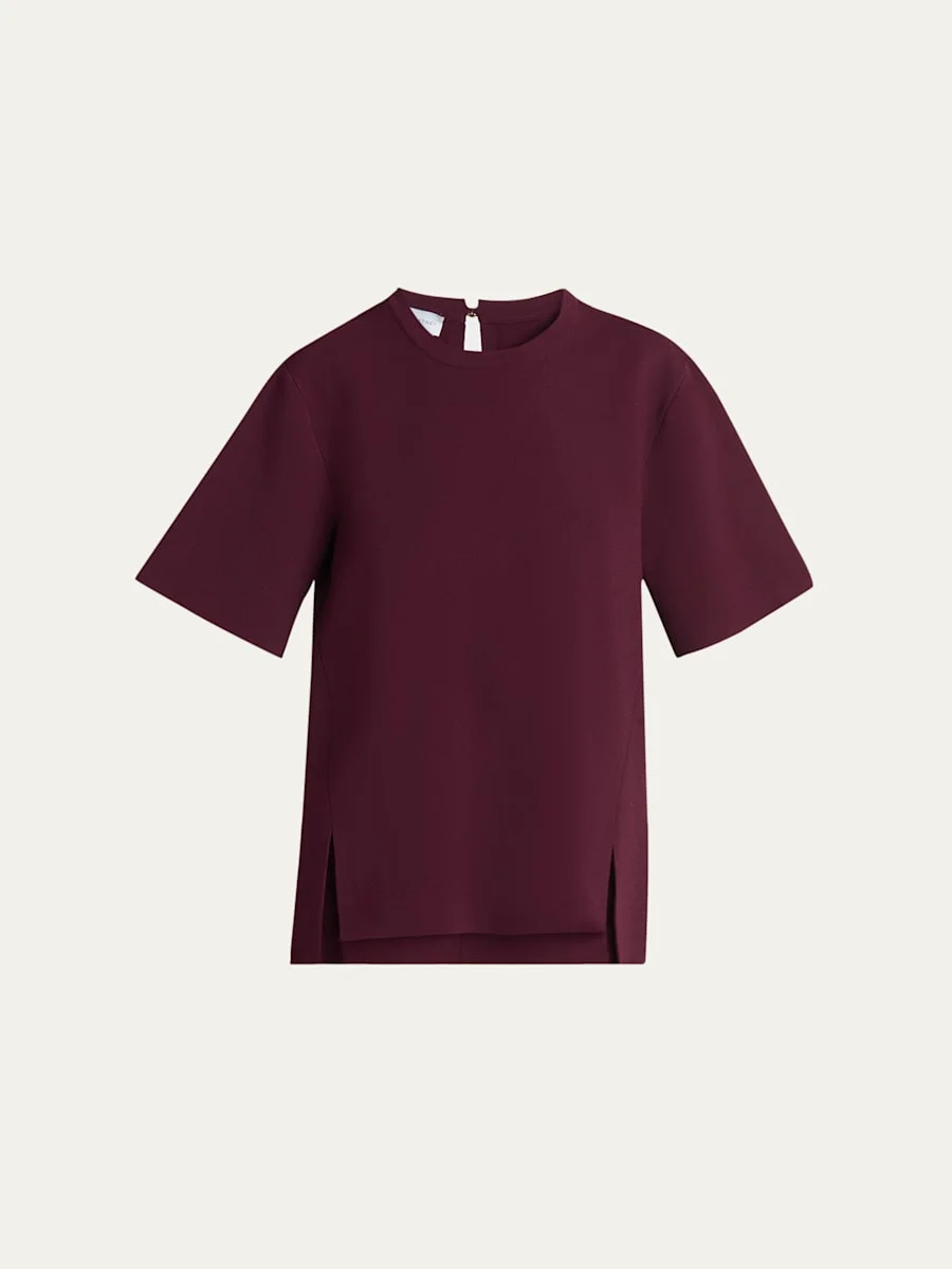 Stella McCartney top in compact knit Crew neckline; button/keyhole back Short sleeves Relaxed fit Stacked hem; side slits Viscose/polyester Made in Italy Model is 5'10"/177cm. Online Inquiries: BGS21_BA371| Store Inquiries: #4814304