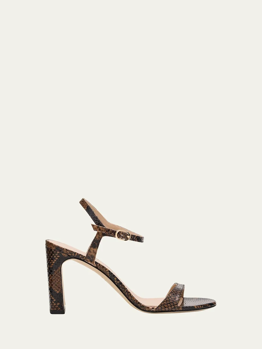 Stuart Weitzman "Babette" sandals in snakeembossed calf leather 3.25 in / 85 mm covered block heel Round open toe Buckle ankle strap Leather lining and outsole Professional cleaning recommended Made in Spain