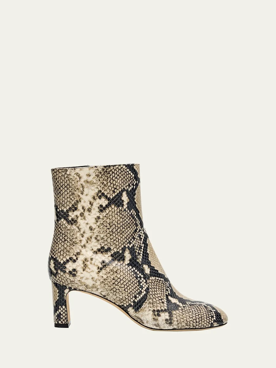 Stuart Weitzman "Babette" booties in snakeprinted calf leather 2.36 in / 60 mm covered block heel Round toe Side zip eases dress Leather lining and outsole Professional cleaning recommended Made in Spain