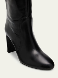 Stuart Weitzman "Babette Tubo" kneehigh boots in smooth calf leather 3.25 in / 85 mm covered block heel Almond toe Pullon style Leather lining and outsole Professional cleaning recommended Made in Spain