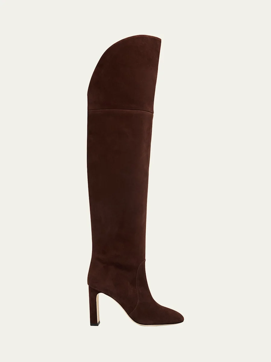 Stuart Weitzman "Babette Tubo" overtheknee boots in supple calfskin suede 3.25 in / 85 mm covered block heel Almond toe Pullon style Leather lining and outsole Professional cleaning recommended Made in Spain