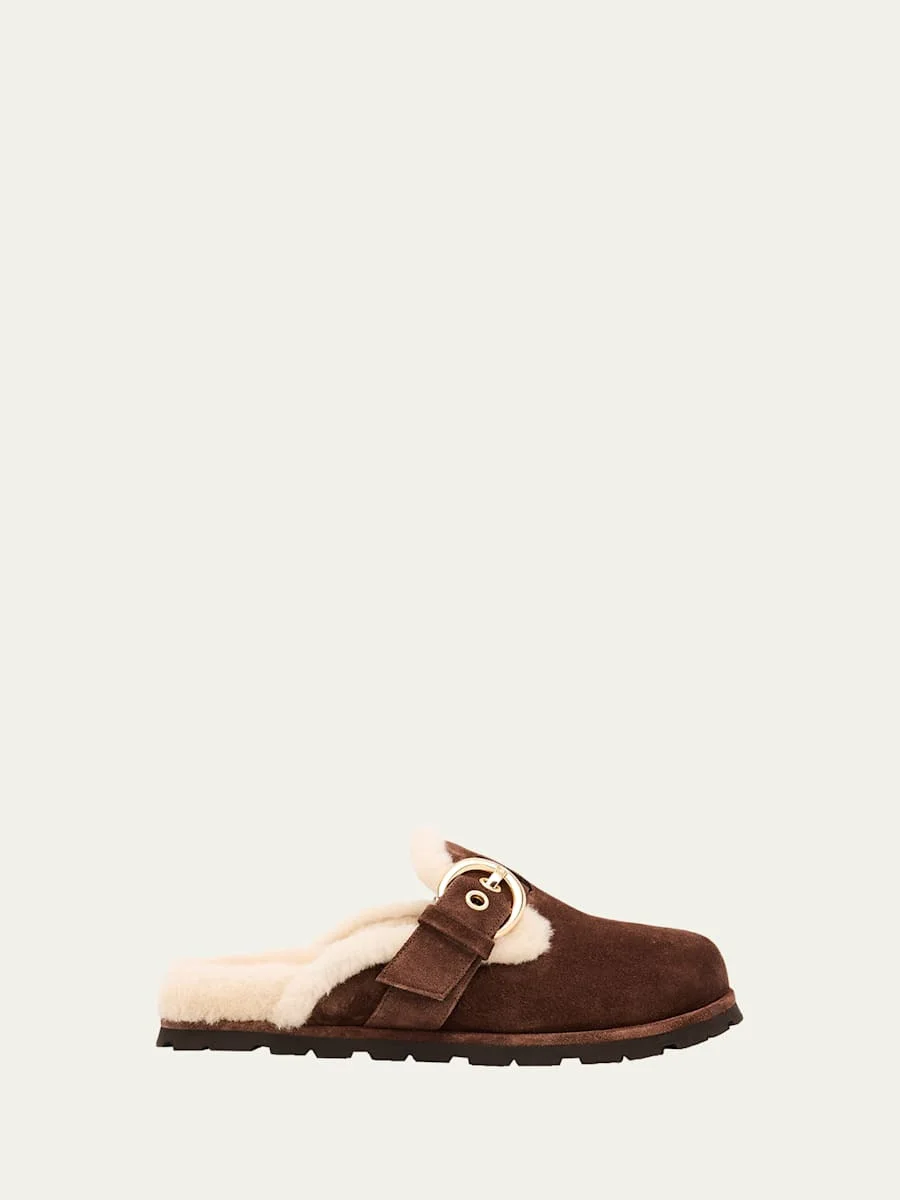 Lined with plush, natural and dyed sheep shearling (Spain) for added warmth and comfort, the "Chrystie" mules by Stuart Weitzman are crafted from supple suede Flat heel Round toe Notched vamp with oversized buckle strap Easy slide style Lightweight, flexible EVA outsole Hand wash Made in Spain