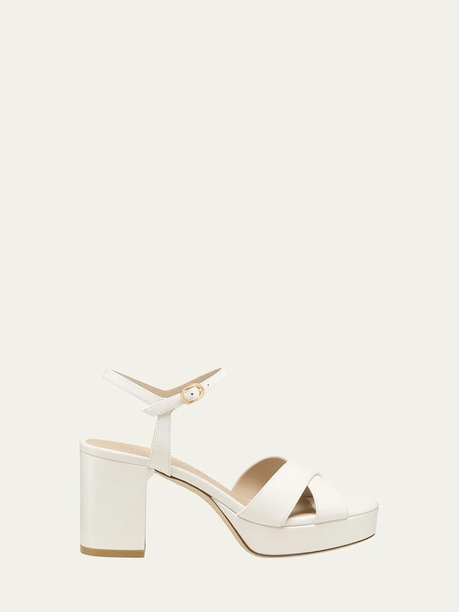 Stuart Weitzman "Dayna" smooth calf leather platform sandals 3.15 in / 80 mm block heel Open toe Crisscross vamp Adjustable ankle strap Leather outsole Lining: Leather Professional cleaning recommended Made in Spain